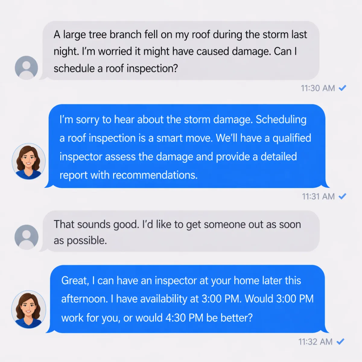Never Miss a Lead or Booking: RapidBook Pro responds instantly, keeps potential customers engaged, and converts inquiries into Roof Inspection Appointments, automatically.